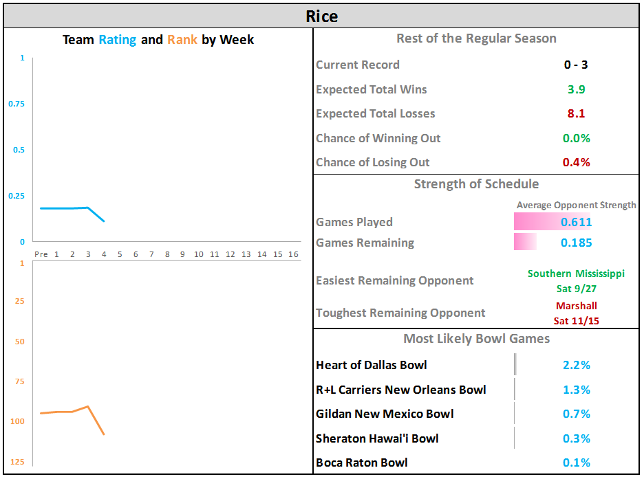 - Rice's opponents so far (Notre Dame, Texas A&M, Old Dominion) have an average rating of 0.611.